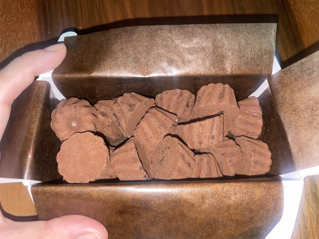 お味はとても美味しかったです!甘すぎなく濃厚なチョコレートで、舌の上でとろける食感が素晴らしかったです。冷蔵庫保存している場合は、常温においてから食べた方が良いと思いました。